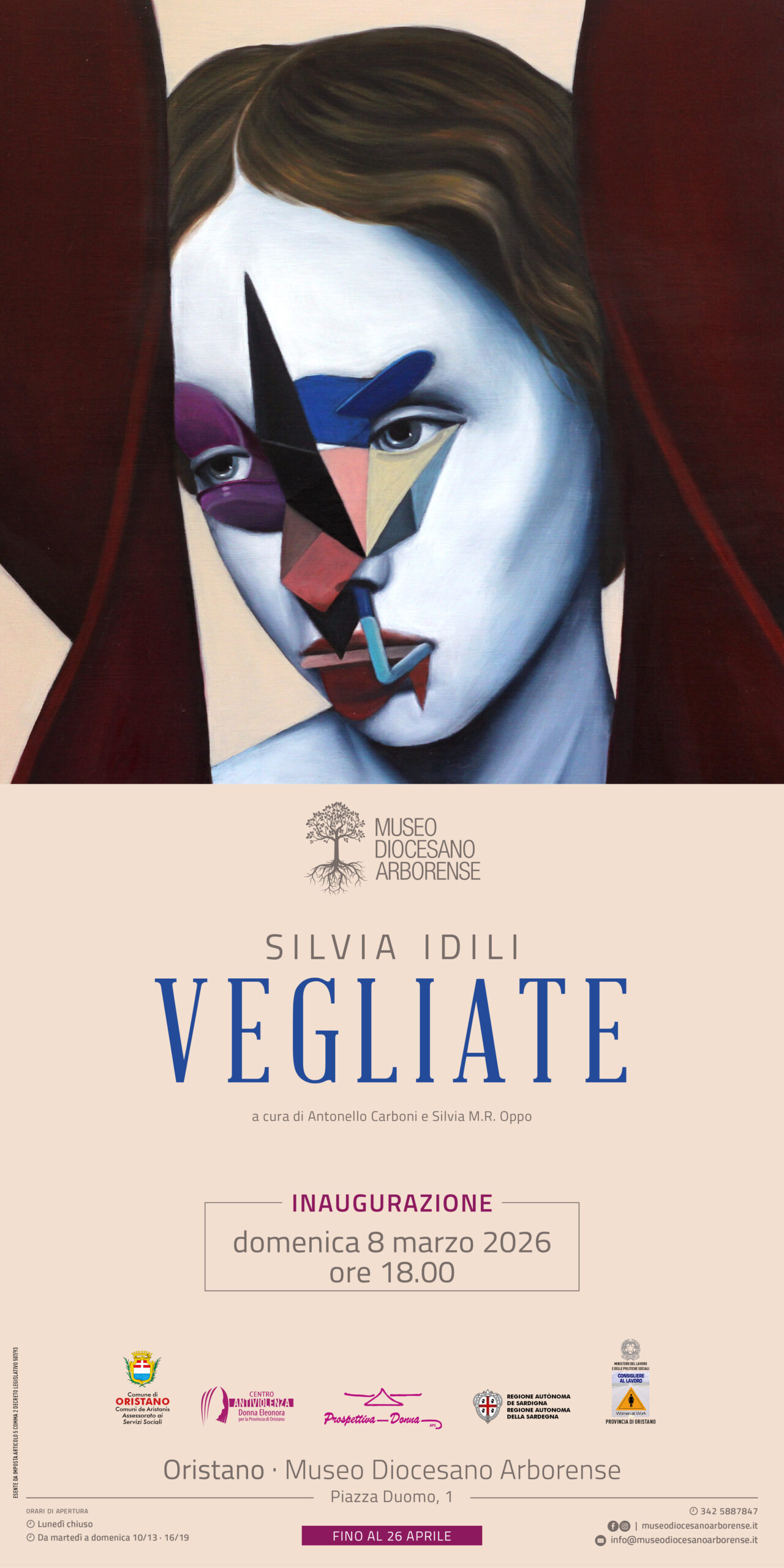 In occasione della Giornata Internazionale della Donna, domenica 8 marzo 2026 alle ore 18.00, il Museo Diocesano Arborense inaugura la mostra “Vegliate” dell’artista Silvia Idili, curata da Antonello Carboni e Silvia M.R. Oppo, promossa in collaborazione con il Centro Antiviolenza “Donna Eleonora” e l’Associazione Prospettiva Donna. L’iniziativa, realizzata con il patrocinio della Regione Autonoma della Sardegna, del PLUS – Distretto di Oristano, del Comune di Oristano e della Consigliera di Parità della Provincia di Oristano, si inserisce in un percorso condiviso che riconosce nella cultura una manifestazione essenziale al servizio della società.